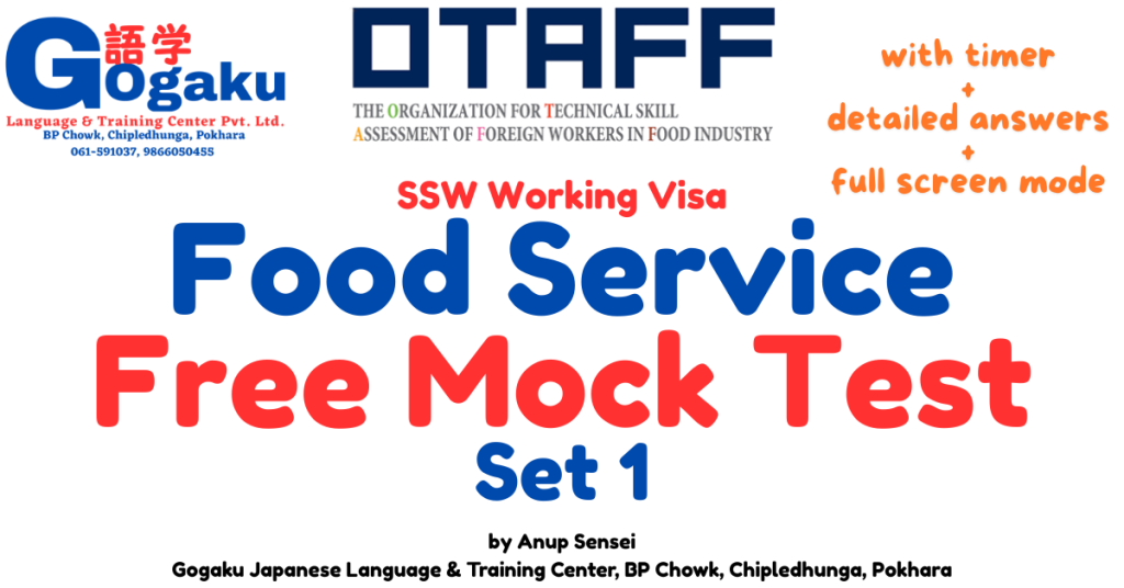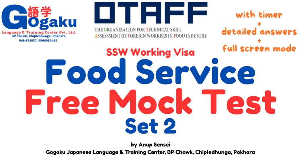 SSW Food Service Mock Test Set 2 | 特定技能 外食業 模擬試験(無料)– Practice for Exam Success 🍱 SSW Food Service Mock Test Set 2 (特定技能 外食業 模擬テスト) Are you preparing for the SSW (Specified Skilled Worker – Food Service) exam? Whether you are currently: 🇯🇵 Working inside Japan and planning to change or upgrade your visa 🌏 Preparing from Nepal or overseas before coming to Japan consistent practice is the fastest way to pass the 外食業技能測定試験. To support your preparation, Gogaku Language & Training Center proudly presents: 👉 SSW Food Service Mock Test – Set 2 This is the continuation of our practice series after Set 1, designed to simulate real exam conditions. 📘 特定技能 外食業とは? (What is SSW Food Service?) 特定技能(SSW)外食業は、日本のレストラン・飲食店・フードサービス業界で働くための在留資格です。 You must pass: 外食業技能測定試験 (Food Service Skill Test) 日本語試験(JLPT または JFT Basic) この試験では、以下の知識が求められます: 食品衛生(Food Hygiene) 接客サービス(Customer Service) 店舗運営(Restaurant Operations) 安全管理(Safety Management) SSW Food Service · Japan vibe card 🍣 🥢 📚 Looking for all SSW Food Service practice exams? 特定技能 食品サービス Specified Skilled Worker — Food Service industry 👉 View Complete SSW Food Service Prep Guide or directly: gogakueducation.com/ssw-food-service-mock-tests ✅ All practice exams included 🍜 Japan food service focused ⛩️ SSW 特定技能 🧠 Why Practice Mock Tests? Many candidates fail not because the exam is difficult — but because they lack exam familiarity. Our mock tests help you: ✅ Understand question patterns✅ Improve Japanese technical vocabulary✅ Practice time management✅ Build confidence before the real test 本番試験と同じ感覚で練習できます。 🎯 Mock Test Set 2 – Start Practice 👉 Take the test below (Full Screen Recommended) 📱 How to Use This Mock Test フルスクリーンで開始してください 制限時間を意識して解答する 実際の試験だと思って挑戦しましょう 💡 Tip: Avoid checking answers during the test. 👨‍🏫 About Anup Sensei This mock test series is developed under the guidance of Anup Sensei, founder of Gogaku Language & Training Center. JLPT N2 Certified (日本語能力試験 N2 合格) Former Store Manager in Japan’s Food Service Industry Years of real working experience in Japanese restaurants Extensive experience training students for Japan study and working visas 日本での実務経験をもとに、実際の現場に近い問題を作成しています。 His goal is simple: 👉 Help students succeed in Japan with practical knowledge — not only theory. 🏫 About Gogaku Language & Training Center Gogaku Language & Training Center specializes in: Japanese Language Training (JLPT / JFT) SSW Working Visa Preparation Japan Student Visa Support Mock Tests & Practical Training We have already supported many candidates moving successfully to Japan. 🌐 Website: https://gogakueducation.com SSW Mock Test Series (Practice Continuously) We are creating a full learning system. Available Sets: Mock Test Set 1 Mock Test Set 2 (Current) Set 3, 4, 5 coming soon… 継続的な練習が合格への近道です。 For Students Inside Japan 日本在住の方へ: 仕事をしながらでも、毎日少しずつ練習することで合格率が大きく上がります。 スマホからいつでも無料で練習可能です。 For Students Outside Japan 海外から準備している方へ: 来日前に試験対策を始めることで、日本到着後すぐに就職チャンスが広がります。 今から準備を始めましょう。 Start Practicing Now Take SSW Food Service Mock Test Set 2 above and test your readiness today. 合格は準備している人に訪れます。